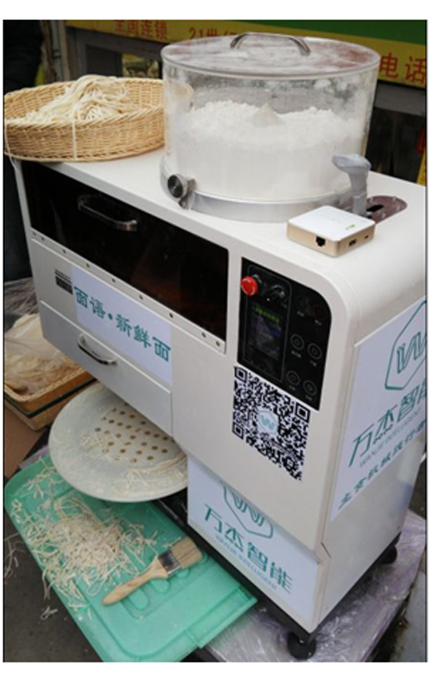 就食品安全而言,消費(fèi)者從機(jī)器頂端圓形的落面裝置以及外置水箱就能看出,智能鮮面機(jī)原料只有面粉和水,制作過程安全透明,全面保障面條衛(wèi)生安全。