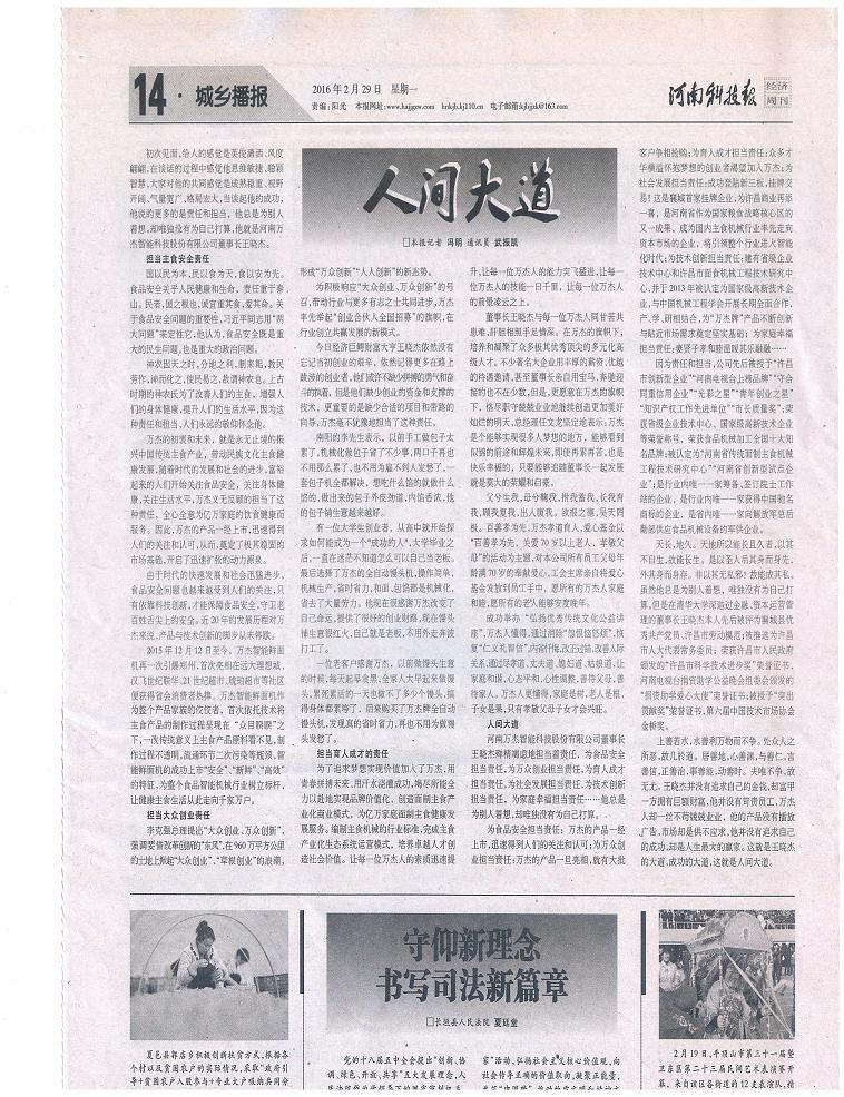 初次見面,給人的感覺是英俊瀟灑、風度翩翩,在談話的過程中感覺他思維敏捷、聰穎智慧,大家對他的共同感覺是成熟穩(wěn)重、視野開闊、氣量寬廣、格局宏大,當談起他的成功,他說的更多的是責任和擔當,他總是為別人著想,卻唯獨沒有為自己打算,他就是河南萬杰智能科技股份有限公司董事長王曉杰。 擔當主食安全責任 國以民為本,民以食為天,食以安為先。食品安全關乎人民健康和生命,責任重于泰山。民者,國之根也,誠宜重其食,愛其命。關于食品安全問題的重要性,習近平同志用“兩大問題”來定性它,他認為,食品安全既是重大的民生問題,也是重大的政治問題。 神農因天之時,分地之利,制耒耜,教民勞作,神而化之,使民易之,故謂神農也。上古時期的神農氏為了改善人們的主食,增強人們的身體健康,提升人們的生活水平,因為這種責任和擔當,人們永遠的敬仰懷念他。 萬杰的初衷和未來,就是永無止境的振興中國傳統(tǒng)主食產業(yè),帶動民族文化主食健康發(fā)展,隨著時代的發(fā)展和社會的進步,富裕起來的人們開始關注食品安全,關注身體健康,關注生活水平,萬杰義無反顧的擔當了這種責任,全心全意為億萬家庭的飲食健康而服務。因此,萬杰的產品一經上市,迅速得到人們的關注和認可,從而,奠定了極其穩(wěn)固的市場基礎,開啟了迅速擴張的動力源泉。 由于時代的快速發(fā)展和社會迅猛進步,食品安全問題也越來越受到人們的關注,只有依靠科技創(chuàng)新,才能保障食品安全,守衛(wèi)老百姓舌尖上的安全。近20年的發(fā)展歷程對萬杰來說,產品與技術創(chuàng)新的腳步從未停歇。 2015年12月12日至今,萬杰智能鮮面機再一次引爆鄭州,首次亮相在遠大理想城、汶飛世紀聯(lián)華、21世紀超市、琥珀超市等社區(qū)便獲得省會消費者熱捧。萬杰智能鮮面機作為整個產品家族的佼佼者,首次依托技術將主食產品的制作過程呈現(xiàn)在“眾目睽睽”之下,一改傳統(tǒng)意義上主食產品原料看不見,制作過程不透明,流通環(huán)節(jié)二次污染等瓶頸,智能鮮面機的成功上市“安全”、“新鮮”、“高效”的特征,為整個食品智能機械行業(yè)樹立標桿,讓健康主食生活從此走向千家萬戶。 擔當大眾創(chuàng)業(yè)責任 李克強總理提出“大眾創(chuàng)業(yè)、萬眾創(chuàng)新”,強調要借改革創(chuàng)新的“東風”,在960萬平方公里 的土地上掀起“大眾創(chuàng)業(yè)”、“草根創(chuàng)業(yè)”的浪潮,形成“萬眾創(chuàng)新”“人人創(chuàng)新”的新態(tài)勢。 為積極響應“大眾創(chuàng)業(yè)、萬眾創(chuàng)新”的號召,帶動行業(yè)與更多有志之士共同進步,萬杰率先舉起“創(chuàng)業(yè)合伙人全國招募”的旗幟,在 行業(yè)創(chuàng)立共贏發(fā)展的新模式。 今日經濟巨鱷財富大亨王曉杰依然沒有忘記當初創(chuàng)業(yè)的艱辛,依然記得更多在路上跋涉的創(chuàng)業(yè)者,他們或許不缺少拼搏的勇氣和奮斗的執(zhí)著,但是他們缺少創(chuàng)業(yè)的資金和支撐的技術,更重要的是缺少合適的項目和帶路的向導,萬杰毫不猶豫地擔當了這種責任。 南陽的李先生表示,以前手工做包子太累了,機械化做包子省了不少事,兩口子再也不用那么累了,也不用為雇不到人發(fā)愁了,一套包子機全都解決,想吃什么餡的就做什么餡的,做出來的包子外皮勁道,內餡香濃,他的包子鋪生意越來越好。 有一位大學生創(chuàng)業(yè)者,從高中就開始探求如何能成為一個“成功的人”,大學畢業(yè)之后,一直在迷茫不知道怎么可以自己創(chuàng)業(yè)。zui后選擇了萬杰的全自動饅頭機,操作簡單,機械生產,省時省力,和面、包餡都是機械化,省去了大量勞力。他現(xiàn)在很感謝萬杰改變了自己命運,提供了很好的創(chuàng)業(yè)財路,現(xiàn)在饅頭鋪生意很紅火,自己創(chuàng)業(yè),不用外走奔波打工了。 一位老客戶感謝萬杰,以前做饅頭生意的時候,每天起早貪黑,全家人大早起來做饅頭,累死累活的一天也做不了多少個饅頭,搞得身體都累垮了,后來購買了萬杰牌全自動饅頭機,發(fā)現(xiàn)真的省時省力,再也不用為做饅 頭發(fā)愁了。 擔當育人成才的責任 為了追求夢想實現(xiàn)價值加入了萬杰,用青春拼搏未來、用汗水澆灌成功,竭盡所能全力以赴地實現(xiàn)品牌價值化,創(chuàng)造面制主食產業(yè)化商業(yè)模式,為億萬家庭面制主食健康發(fā)展服務。編制主食執(zhí)械的行業(yè)標準,完成主食產業(yè)化生態(tài)系統(tǒng)運營模式,培養(yǎng)卓越人才創(chuàng)造社會價值。讓每一位萬杰人的素質迅速提升,讓每一位萬杰人的能力突飛猛進,讓每一位萬杰人的技能一日千里,讓每一位萬杰人的前景凌云之上。 董事長王曉杰與每一位萬杰人同甘苦共患難,肝膽相照手足情深。在萬杰的旗幟下,培養(yǎng)和凝聚了眾多極其優(yōu)秀頂尖的多元化高級人才。不少著名大企業(yè)用豐厚的薪資、優(yōu)越的待遇邀請,甚至董事長親自用寶馬、奔馳迎接的也不在少數(shù),但是,更愿意在萬杰的旗幟下,恪盡職守兢兢業(yè)業(yè)地繼續(xù)創(chuàng)造更加美好燦爛的明天,總經理任文龍堅定地表示:萬杰是個能夠實現(xiàn)很多人夢想的地方,能夠看到 似錦的前途和輝煌未來,即使再累再苦,也是快樂幸福的,只要能夠追隨董事長一起發(fā)展就是莫大的榮耀和