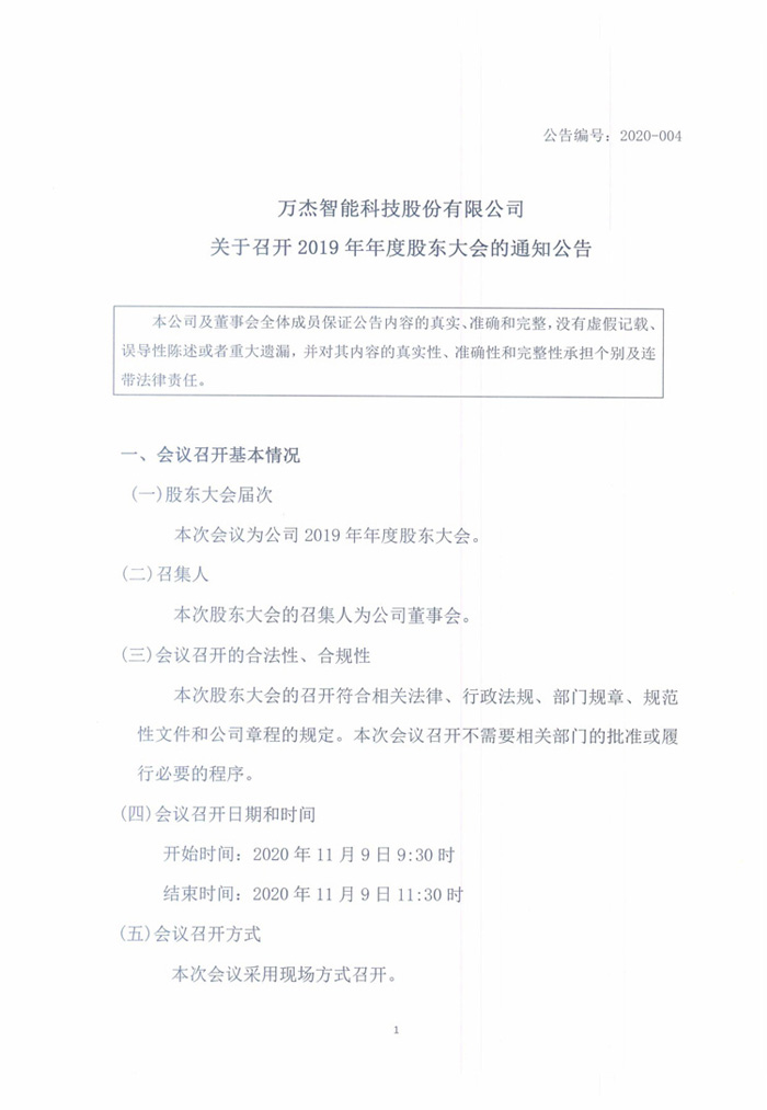 萬杰智能關(guān)于召開2019年年度股東大會的通知公告